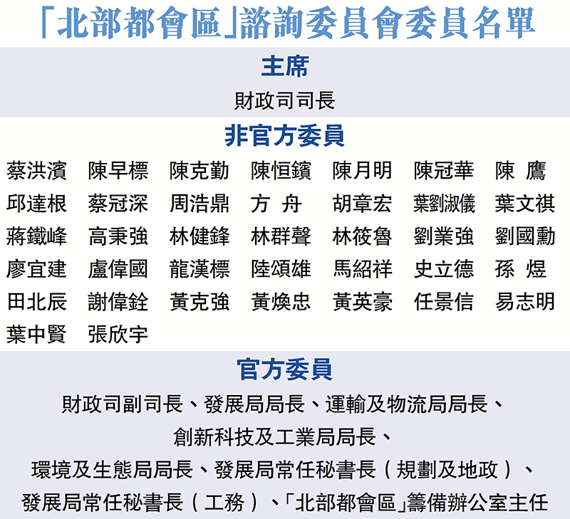 香港文匯報訊 特區政府昨日宣布委任「北部都會區」諮詢委員會的非官方委員,任期為兩年,由昨日起生效(見表)。諮詢委員會將就規劃及落實「北部都會區」的建設,向政府提供意見,範疇包括土地及房屋發展、產業發展、交通及其他基建設施、環境保育及政府設施的提供等。