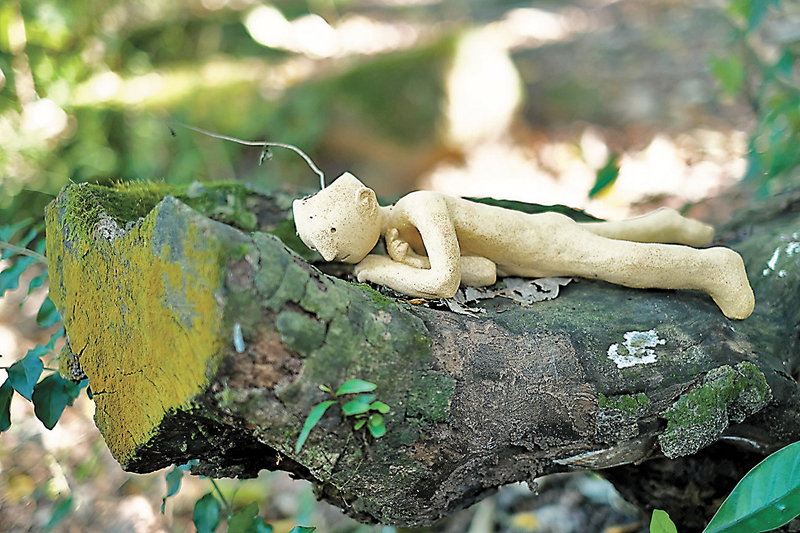 你有好奇過樹木的生命嗎?作品《原點·循環》以樹木的年輪為創作靈感,當費納奇鏡上的角色開始轉動,就像人們進入循環不息的生命循環,與大自然流轉共存。機動雕塑《萌櫱》解作樹木砍掉後重新長出的新芽,藝術家以塌下的台灣相思,結合機械花的盛開,寓意知其不可為而為之。室外裝置《遊枝散策》幻想樹木失去生命之後,化作20件姿態各異的陶人偶,頭上插着斷落的樹枝,穿梭在大樹之間。作品分散在龍虎山環境教育中心的各處,以不同的擬人姿態,探討樹木行將離別時的感受。