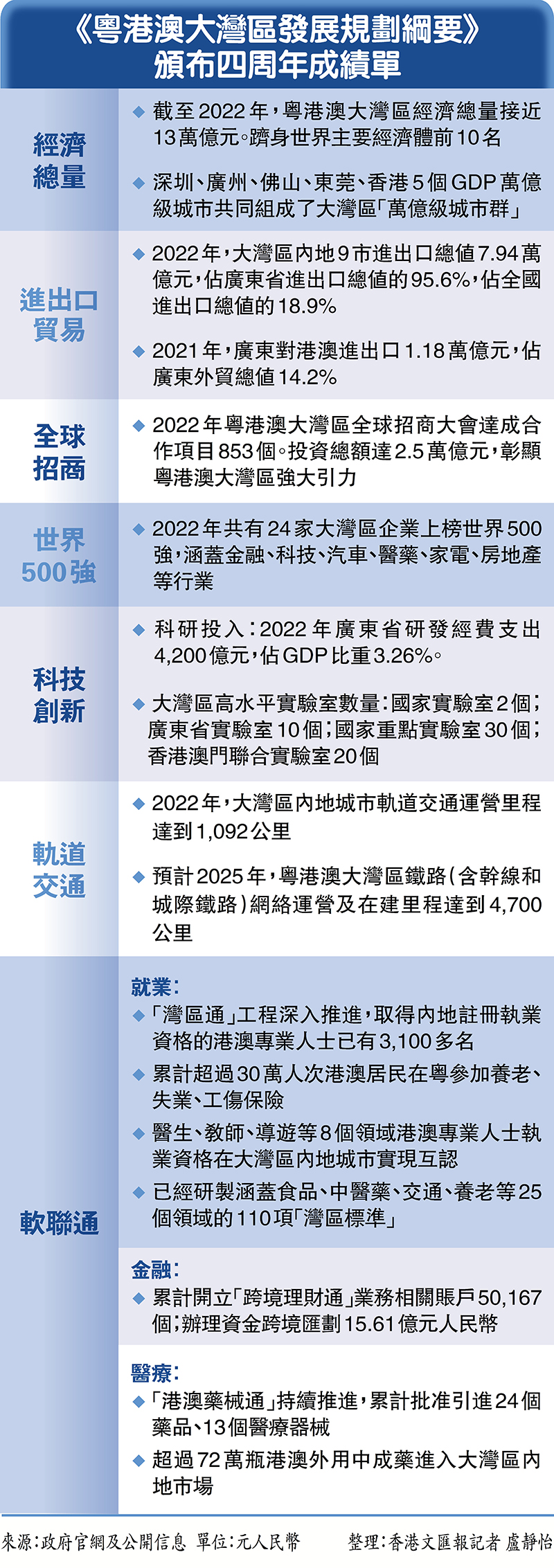 通則暢,暢則興。隨着內地與港澳人員往來全面恢復,流動的大灣區處處生機盎然、活力迸發。前海現代服務業發展提速;南沙進一步深化面向世界的粵港澳全面合作;橫琴服務港澳經濟適度多元發展的作用不斷增強。三大平台正在「以點帶面」引領粵港澳大灣區建設向縱深推進,積極打造高質量融合發展典範。