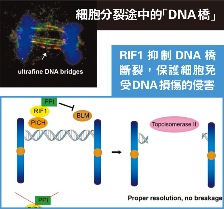 是次研究探討兩種蛋白質RIF1和蛋白磷酸酶1(PP1)在解離「DNA橋」中的作用,包括發現RIF1能抑制雙鏈「DNA橋」轉化為單鏈更易斷裂的「DNA橋」,意味着RIF1能保護細胞免受DNA損傷的侵害。