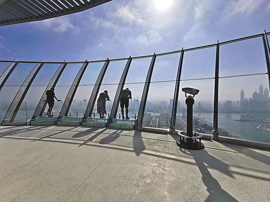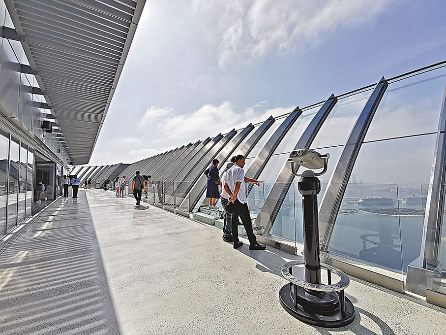 了解歷史後,一部帶有落地數字體驗的電梯,帶大家登上棕櫚塔頂部的觀景台,先到52層,有玻璃圍欄着,讓你在離地面240米的高空欣賞壯觀的景色。