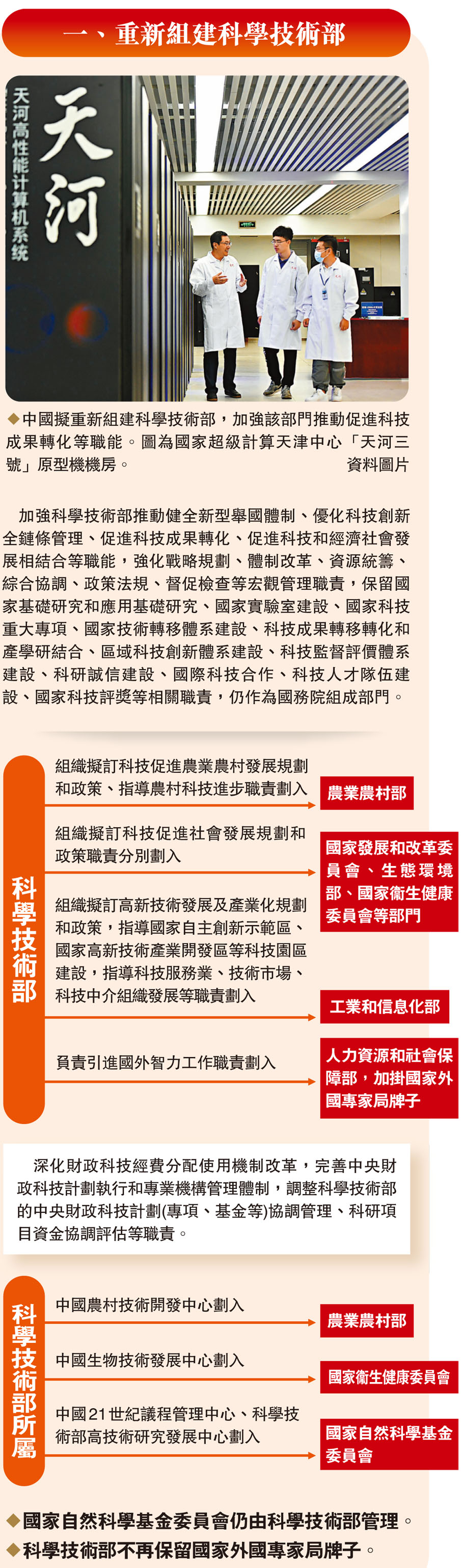 加強科學技術部推動健全新型舉國體制、優化科技創新全鏈條管理、促進科技成果轉化、促進科技和經濟社會發展相結合等職能,強化戰略規劃、體制改革、資源統籌、綜合協調、政策法規、督促檢查等宏觀管理職責,保留國家基礎研究和應用基礎研究、國家實驗室建設、國家科技重大專項、國家技術轉移體系建設、科技成果轉移轉化和產學研結合、區域科技創新體系建設、科技監督評價體系建設、科研誠信建設、國際科技合作、科技人才隊伍建設、國家科技評獎等相關職責,仍作為國務院組成部門。