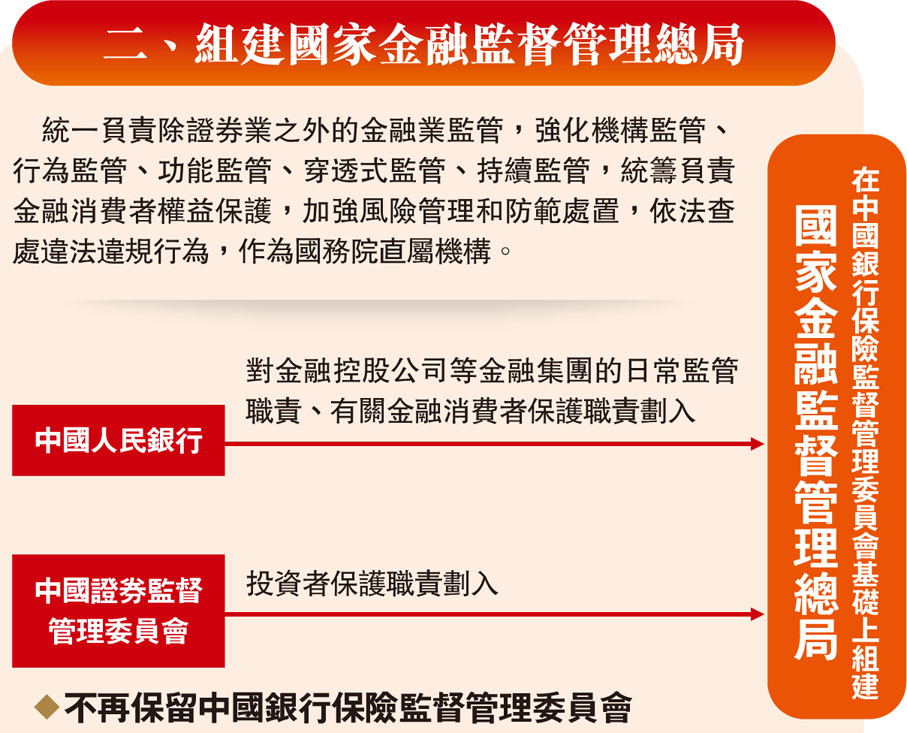 統一負責除證券業之外的金融業監管,強化機構監管、行為監管、功能監管、穿透式監管、持續監管,統籌負責金融消費者權益保護,加強風險管理和防範處置,依法查處違法違規行為,作為國務院直屬機構。