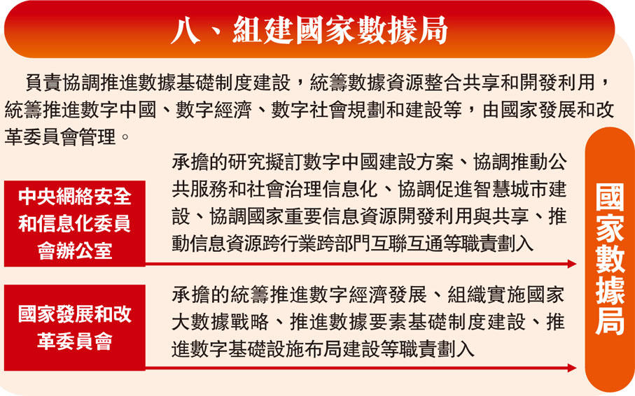 負責協調推進數據基礎制度建設,統籌數據資源整合共享和開發利用,統籌推進數字中國、數字經濟、數字社會規劃和建設等,由國家發展和改革委員會管理。