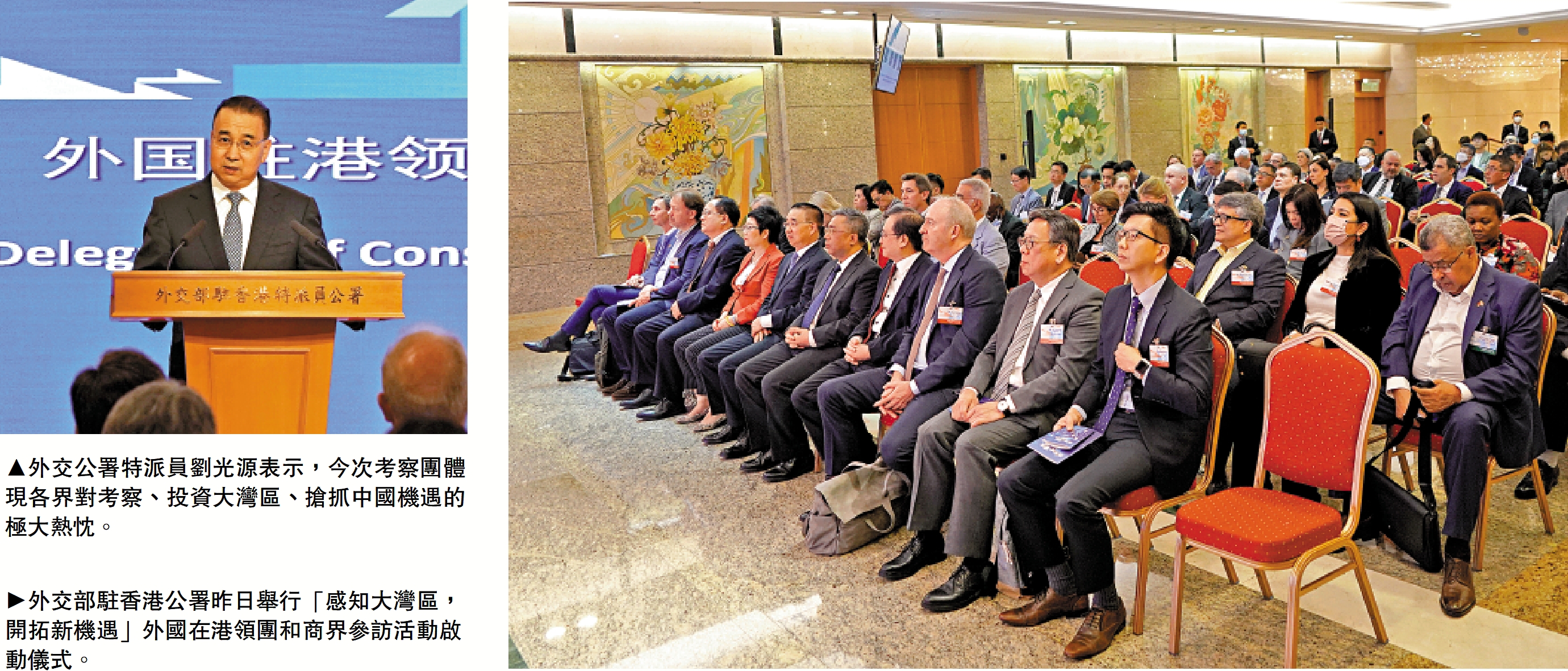 圖右:外交部駐香港公署昨日舉行「感知大灣區,開拓新機遇」外國在港領團和商界參訪活動啟動儀式。