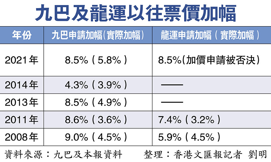 九巴過去20年先後加價5次,累計加幅28%,同期通脹累計增加53%,巿民的家庭收入則累計上升68%;龍運巴士於2018年申請加價,至2021年被否決,20年間加價兩次,累計加幅約7.8%(見表)。許鎮德在專訪中表示,九巴及龍運巴士去年分別虧蝕470萬元及2,780萬元,若不計算政府因應新冠疫情作出的一次過補貼,九巴虧損估計將達數億元,龍運虧蝕亦相當嚴重。