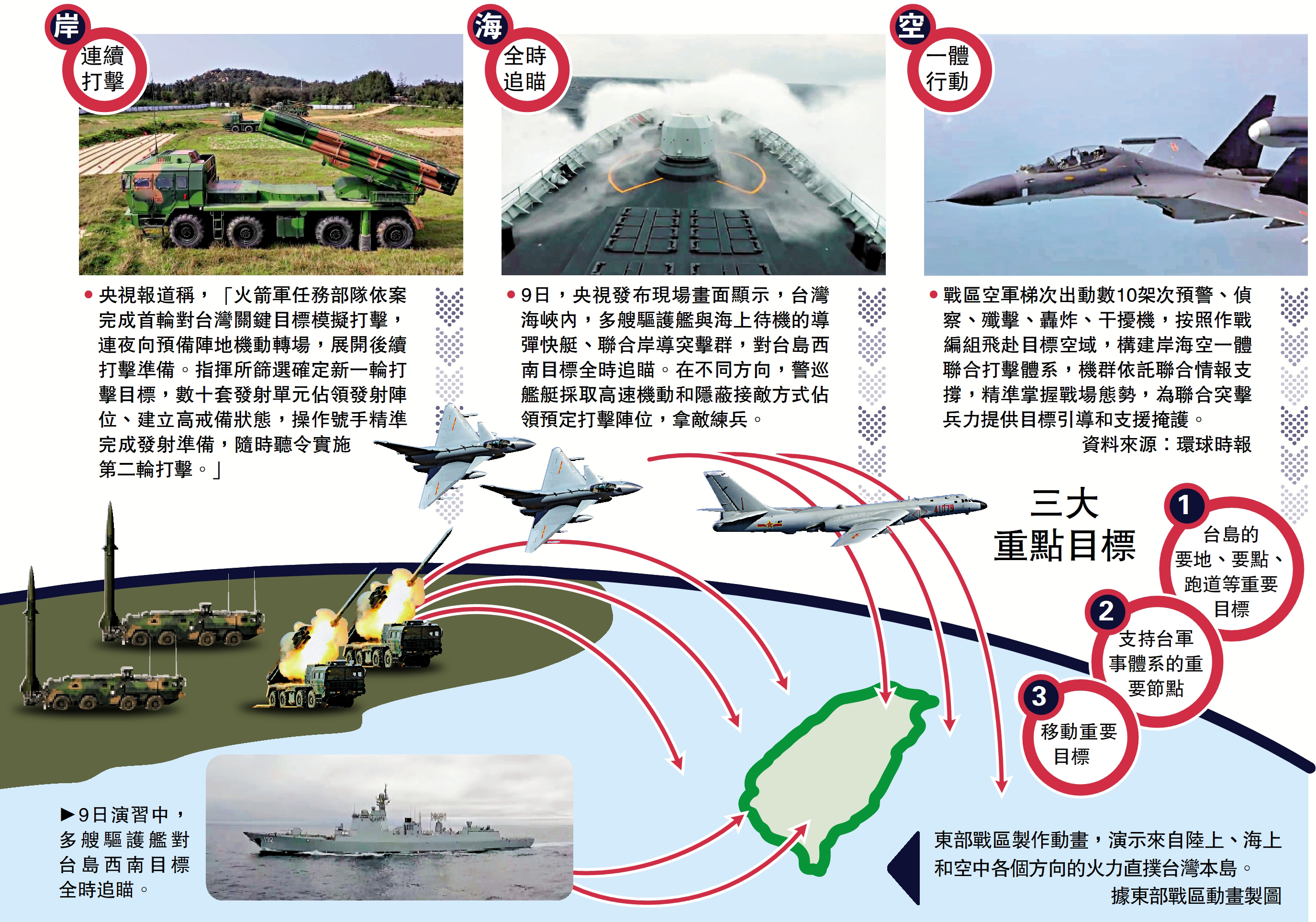 •9日,央視發布現場畫面顯示,台灣海峽內,多艘驅護艦與海上待機的導彈快艇、聯合岸導突擊群,對台島西南目標全時追瞄。在不同方向,警巡艦艇採取高速機動和隱蔽接敵方式佔領預定打擊陣位,拿敵練兵。