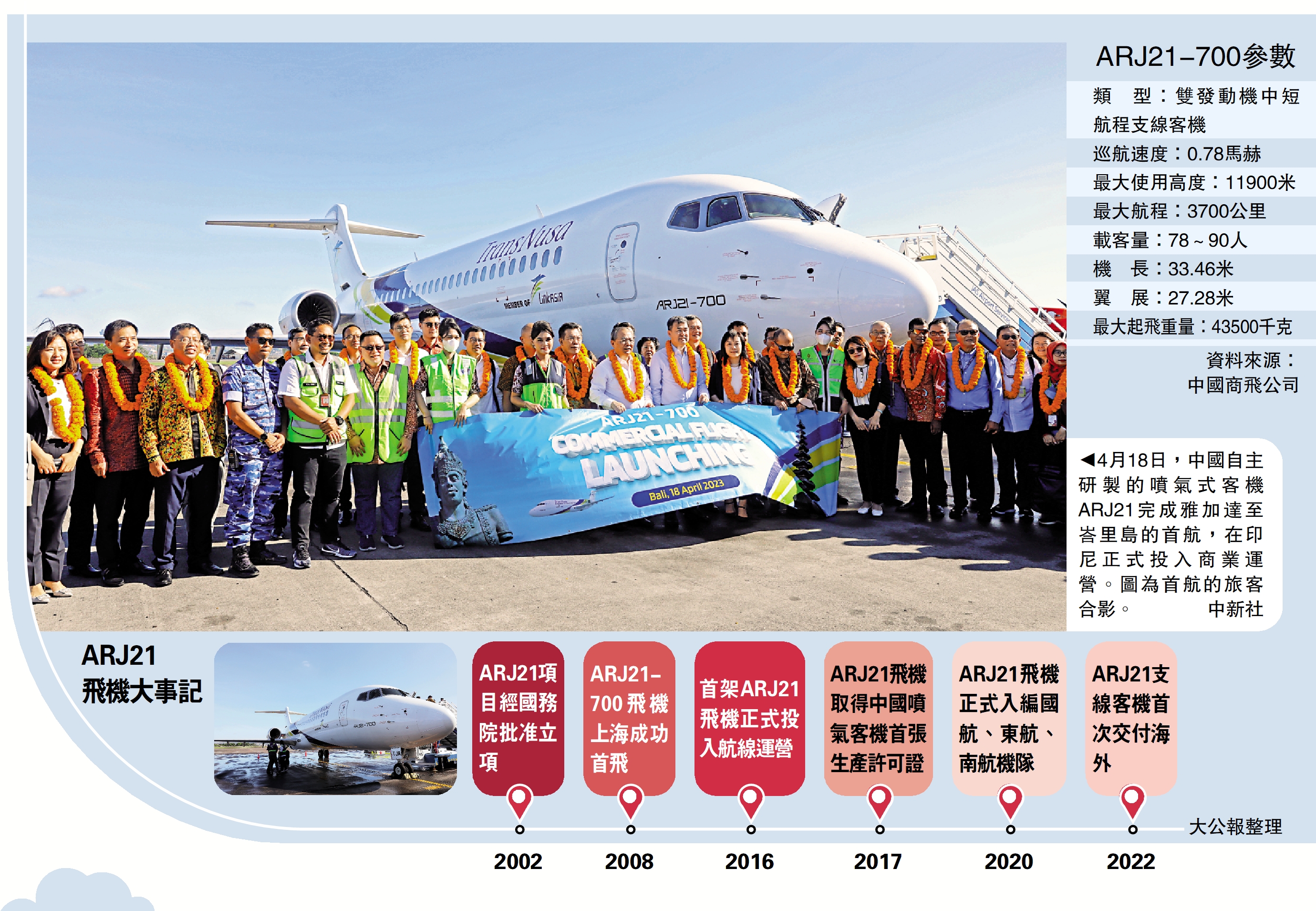 中國自主研製的噴氣式客機,首次在「千島之國」印尼翱翔。當地時間18日12時50分許,一架編號8B5112的印尼翎亞航空ARJ21飛機從雅加達起飛,2個小時後平穩降落在峇里島伍拉萊國際機場,完成在印尼的首航,正式投入商業運營。這標誌着,中國商飛研製的ARJ21飛機成功完成了海外首航,在印尼正式開啟國際市場運營的「新航程」,成為中國自主研製的噴氣式客機海外第一單。\綜合大公報記者劉凝哲、中新社報道