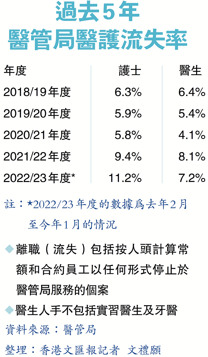 香港公立醫院雖然鬧「護士荒」,但新入職護士人數每年遞增,由2008/09年度的2,423人,增至2021/22年度2,559人,本年度截至今年一月亦有2,290人入行,惟整體流失率卻屢見新高,以致總體護士人數沒有明顯增長,根據醫管局最新數據,截至今年1月全職護流失率攀升至11.2%,是5年高位,比醫生的流失問題還要嚴重。