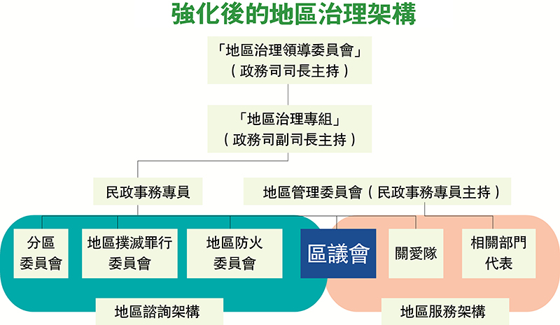 第六,強化地區治理架構,包括成立由政務司司長主持的「地區治理領導委員會」,領導地區治理整體策略、政策和措施;以及將現時由政務司副司長主持的「地區事項統籌工作組」重新定位,改名為「地區治理專組」,統籌和指揮各政策局和部門的地區工作,並取代原有的「地方行政督導委員會」。