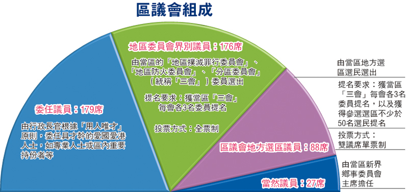 委任、界別選舉、直選比例4:4:2 當區民政專員任區會主席 區會全面重塑 完善地區治理