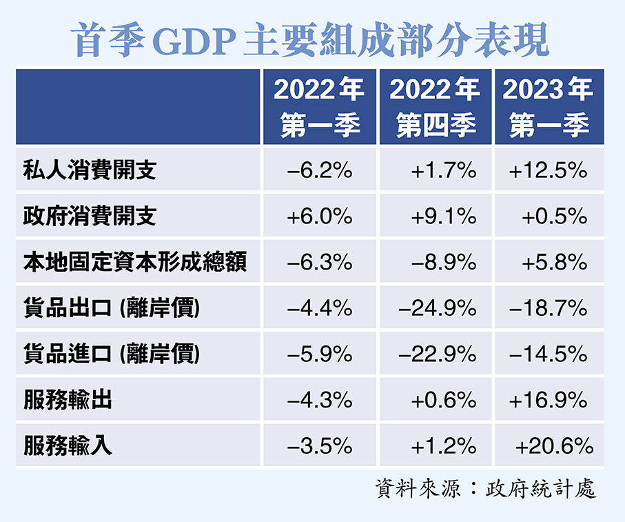 星展銀行(香港)經濟研究部經濟師謝家曦認為,首季私人消費開支升勢凌厲,佔GDP60%。本港3月取消「口罩令」後整體經濟大部分復常,加上勞動人口負增長亦逐步改善,反映整體勞工市場良好,都帶動私人消費開支。固定資本形成亦較預期理想,由於經濟增長勢頭良好,投資逐步改善,結束連續多季負增長。