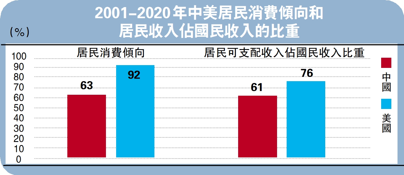 在全球主要國家中,中美兩國的總需求結構正好相反,中國是投資高、消費低,美國是消費高、投資低。居民消費率的高低取決於兩個因素:其一,消費傾向,這等於每一元可支配收入中用於消費的比重;其二,國民收入中居民可支配收入的比重。比較中美兩國居民收入佔比和居民消費傾向可知:2001至2020期間,中國居民收入佔比平均只有61%,而美國是76%;中國居民消費傾向是63%,而美國是92%。