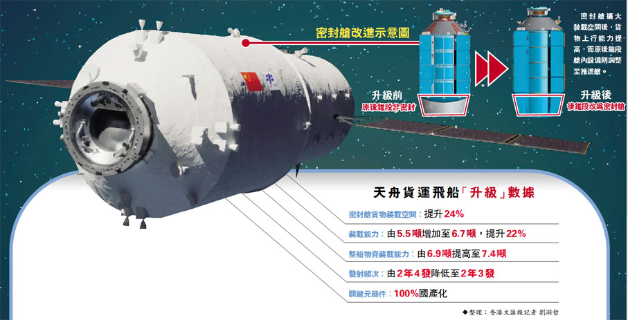改進型天舟飛船的貨運「噸位」提升後,使貨運飛船發射頻次得以由2年4發降低至2年3發,這將切實提高中國太空站工程綜合效益,預計將節約經費上億元。