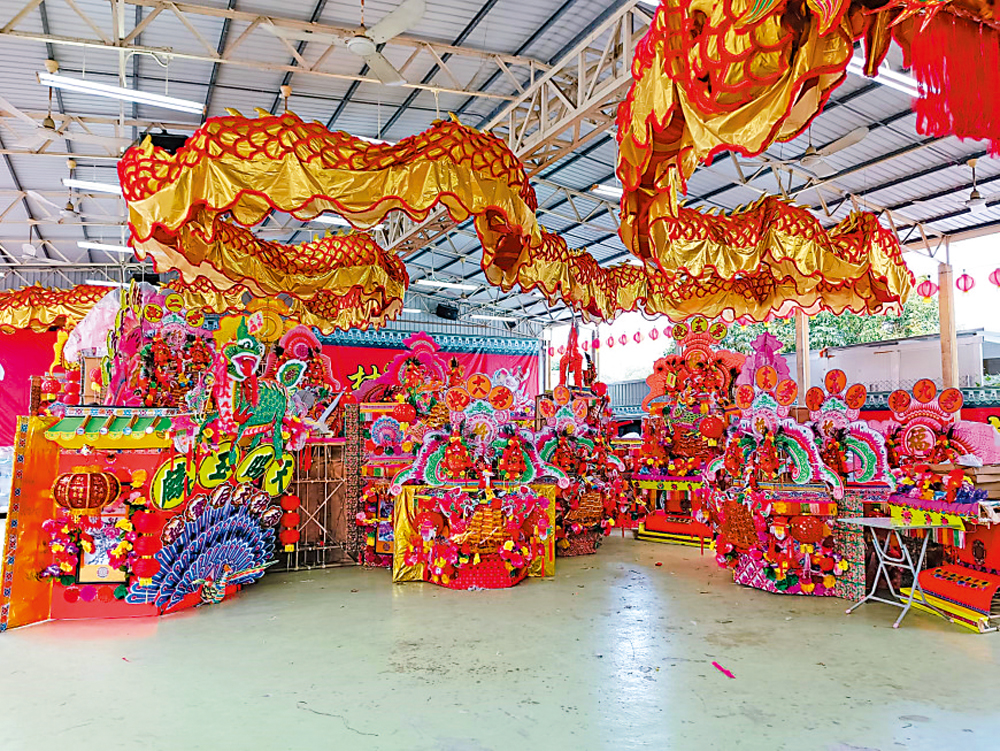 經過紙紮師傅和村民共200多人的共同努力,早前抽中「第三炮」的元朗崇正新村,在星期二下午完成巡遊花炮組裝(見圖),並擺放在村中央位置,供村民上香祈福。