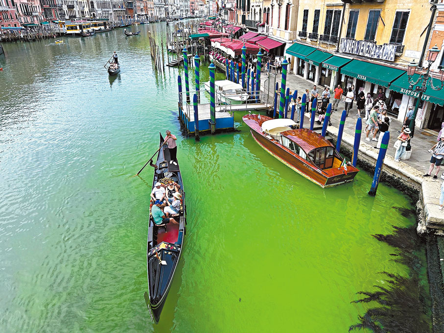 香港文匯報訊 意大利水都威尼斯的大運河部分河段河水,前日變成詭異的「熒光綠」(圖),警方疑是環保人士所為,當局已緊急抽驗河水。