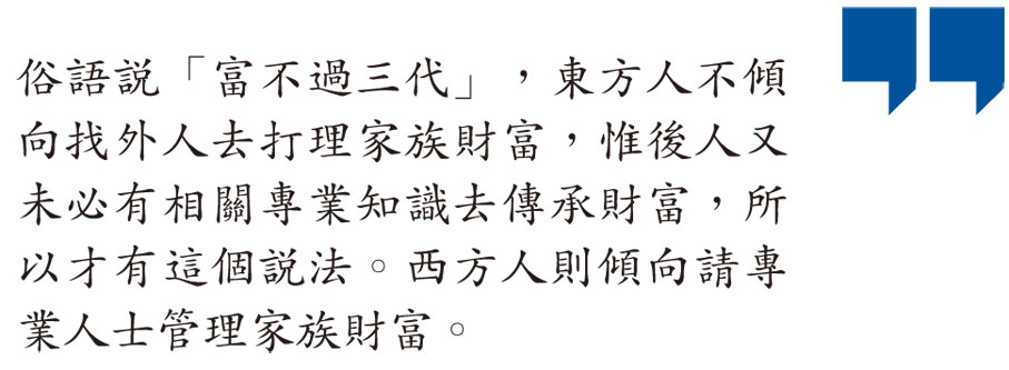 俗語說「富不過三代」,東方人不傾向找外人去打理家族財富,惟後人又未必有相關專業知識去傳承財富,所以才有這個說法。西方人則傾向請專業人士管理家族財富。