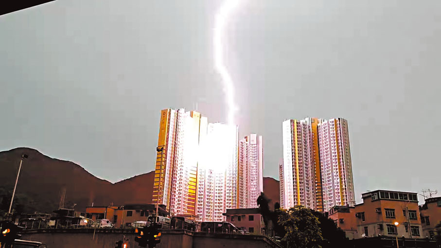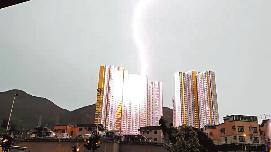 受強烈熱帶風暴「瑪娃」外圍帶影響,香港昨晨出現高溫觸發的雷雨,天文台先後發出雷暴警告和黃色暴雨警告,其間有頻密的雷電。6小時內錄得超過1.2萬次雲對地閃電,電閃雷鳴劃破天空,更罕有地直接擊中建築物外牆。屯門和田邨其中一幢大廈的中層,被雷電「三連擊」劈中,爆出火光,其中一個單位窗外石屎簷篷被劈崩一角,屋內一家四口飽受刺眼黃光和巨響震撼,幸有驚無險。尼泊爾裔女戶主事後形容,當時整間屋都在震動,直呼:「It's scary(太可怕了)」。 ◆香港文匯報記者 蕭景源