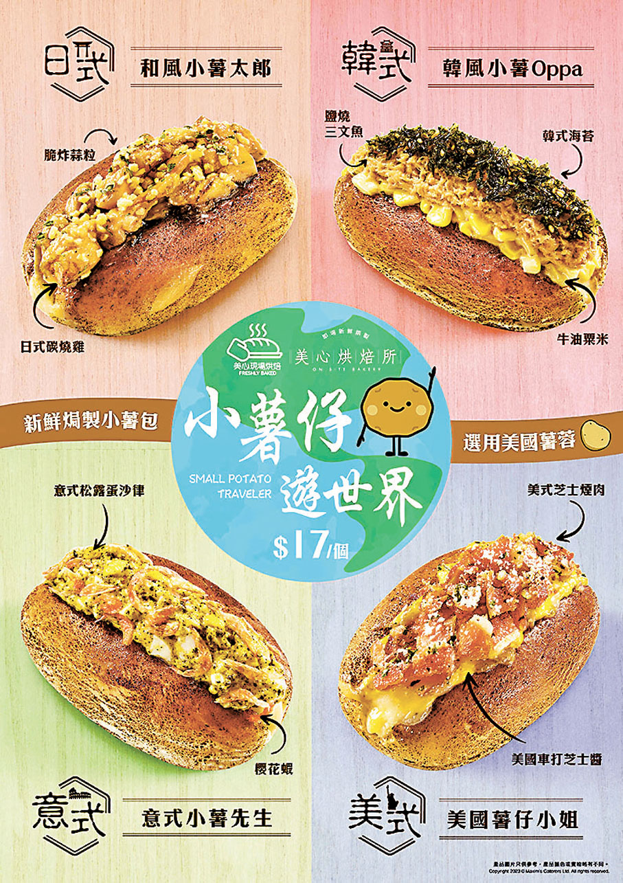薯仔是澱粉家族的資優生,營養價值高、熱量低,配合不同滋味的料理方式更能創出新食潮。現在,美心現場烘焙店及美心烘焙所將麵包和焗薯結合全新推出焗薯包系列,現場新鮮焗製的美味四款似薯非薯的焗薯包,以環球滋味為靈感推出小薯仔遊世界系列:意式小薯先生、和風小薯太郎、韓風小薯OPPA及美國薯仔小姐帶大家味遊世界,以四個國家風味呈現橫跨歐洲、亞洲、美洲的幸福滋味。