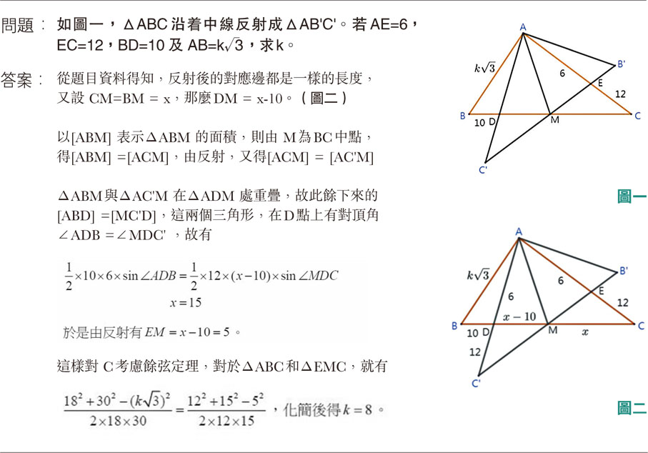 這題做起來,初時用上了反射的性質,然後推出一些線段的長度來,也是典型的步驟。之後見到未知數k,好像也未知怎樣可以聯繫得上已知的許多資料。當中那個未知數x代表的線條,為什麼要特別地關注,而沒有考慮設其他線段為未知數y之類的,也有個具體原因,就是題目裏中線的資料,令人知道BM和CM相等,再由反射之中,又另有B'M和C'M相等,這個長度在圖裏出現了4次,而且又聯繫上中線的資料,看來這條線牽連甚廣,特別地表示成x,再由x表示其他,是有點好處的。