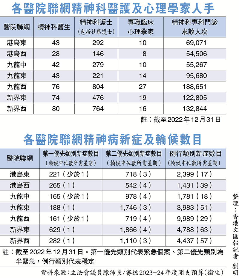 香港近日發生兩宗涉及懷疑精神病患者的悲劇,震驚全港,更令社會普遍關注精神病患者和康復者的支援是否不足的問題。精神健康諮詢委員會昨日開會討論精神健康支援服務,與會的署理醫務衞生局局長李夏茵會後宣布「5+5」改善建議,分別支援精神病復元人士和有精神健康需要的巿民,包括增加醫院管理局人手比例、確立緊急與半緊急新症個案輪候時間目標,以及增加精神科護士服務以盡早作出跟進,而醫管局已完成有關患者「有條件釋放令」機制的檢討,諮詢委員會下次會議將作出討論,並會探討「社會治療令」的可行性。 ◆香港文匯報記者 劉明