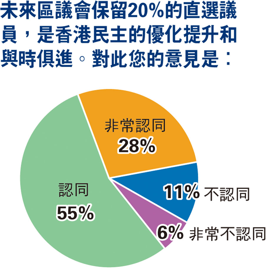 陳財喜表示,83%認為保留直選議員是香港民主的優化提升和與時俱進;88%認同加入委任制及地區委員會界別區議員,有助多渠道廣納各界精英參與區議會工作;78%指地區專員擔任區議會主席可體現行政主導的原則,並將政府政策有效落實到基層。