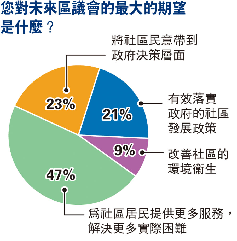 調查亦關注市民對未來區議會期望。陳財喜指出,47%市民冀未來區議會為社區居民提供更多服務及解決困難。其中,市民認為區議員熱心服務最重要,近三成人認為「具有良好的道德操守,熱心社會公益」是未來區議員最重要的特質。其次是「具有踏實肯做、不怕辛勞、不怕麻煩、努力為基層市民服務的精神」、「願意在議會中確切反映居民意見,為居民爭取」及「以開放的態度及當時與居民溝通」。