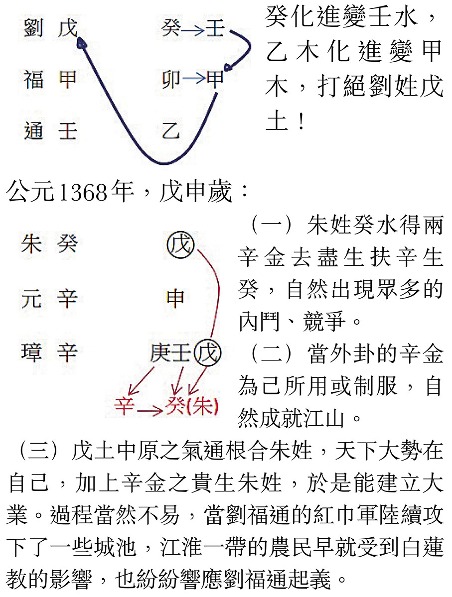 (三)戊土中原之氣通根合朱姓,天下大勢在自己,加上辛金之貴生朱姓,於是能建立大業。過程當然不易,當劉福通的紅巾軍陸續攻下了一些城池,江淮一帶的農民早就受到白蓮教的影響,也紛紛響應劉福通起義。