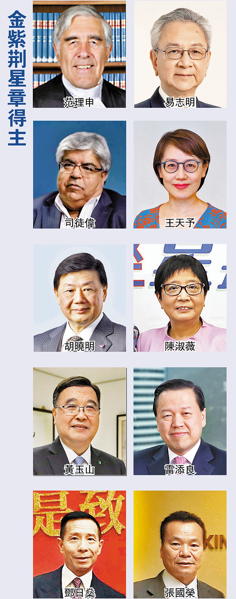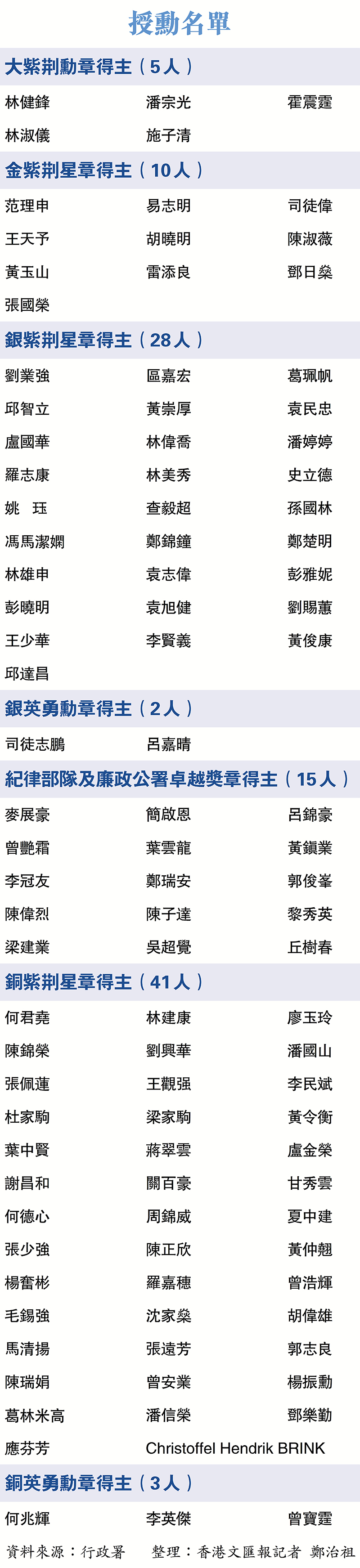 今年共有403人獲行政長官頒授勳銜及作出嘉獎,其中5人獲頒大紫荊勳章;獲頒金紫荊星章10人;銀紫荊星章得主28人;41人獲頒銅紫荊星章。今年獲頒行政長官社區服務獎狀和行政長官公共服務獎狀的分別有75人和88人。