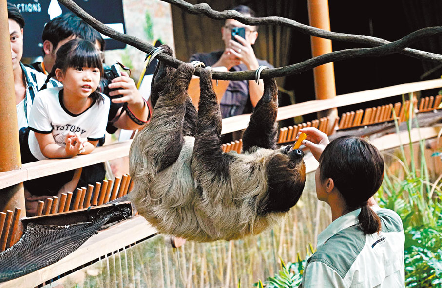 香港海洋公園全新展館「樹懶與好友」昨日舉行開幕禮。展館裝潢模仿樹懶生活的熱帶雨林環境,設有藍天山丘綠地的壁畫及多種植被,樹懶「英木」和「Sonic」分居於場館不同區域。海洋公園動物護理專員劉思穎指出,樹懶主要產自南美洲和中美洲,是獨居動物,故即使是父子平時也不會一起棲息。爸爸「英木」今年15歲,早年由新加坡引進,兒子「Sonic」則是2015年於園內出生。