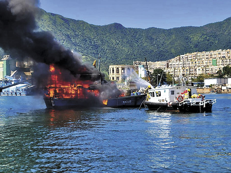 昨日下午約2時許,大埔三門仔對開約百米海面,一艘約二十米長漁船擬出海作業時突然發生火警,火勢猛烈,冒出大量濃煙,船上8名船員慌忙棄船跳海逃生。消防輪出動兩喉兩煙帽隊向漁船射水灌救,大火救熄後船艙被燒剩支架。跳海逃生船員全部獲救,無人受傷,由漁農自然護理署的船隻接載上岸。 ◆香港文匯報記者 蕭景源
