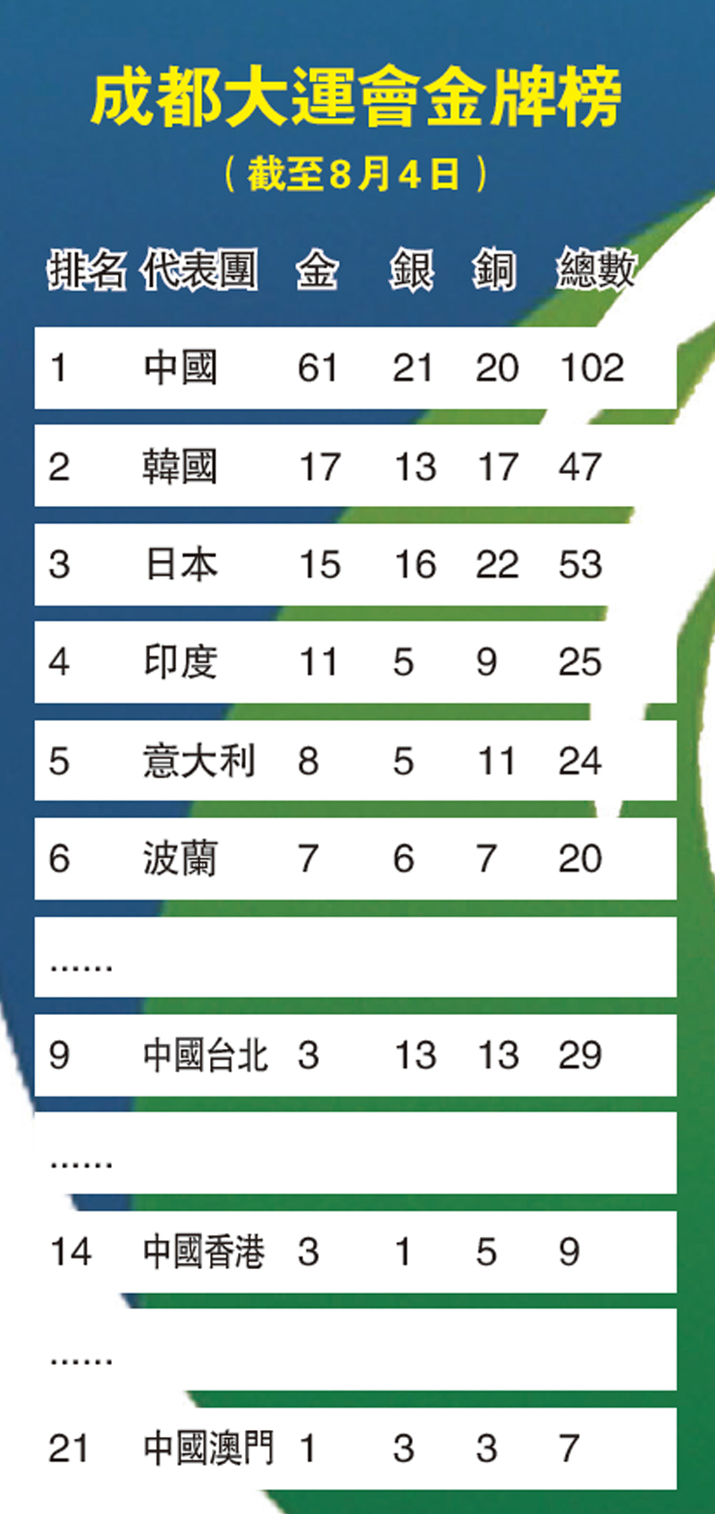 綜合全日賽事,國家隊再收穫12金牌,令中國國家隊以61金21銀20銅,在獎牌榜遠遠拋離其他代表,成一枝獨秀之勢。