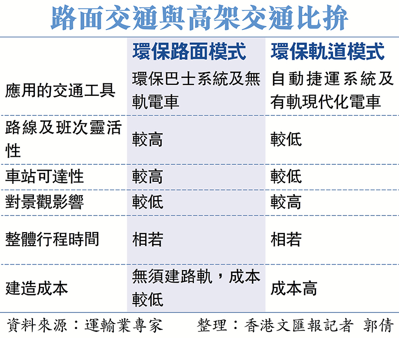 不過,土木工程拓展署的最新交通配套建議文件顯示,與高架軌道捷運系統相比,路面模式因不需興建高架橋和路軌,建造成本較低。另外,路面模式的路線及班次調整的靈活性較高,可配合新發展區的分階段發展和不同時段的實際交通運載需求。在行程時間上,高架軌道捷運系統與路面模式則相若。權衡各種因素後,署方建議新運輸系統採用環保路面模式,交通工具建議採用環保巴士(例如電能或氫能鉸接巴士)或者無軌電車。