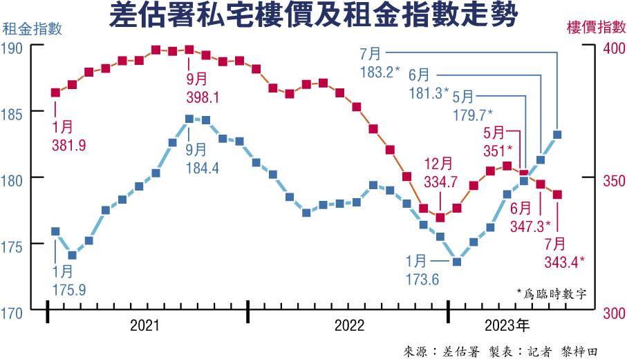 新盤搶吸市場購買力,拖累私宅樓價連續三個月受壓,7月份樓價指數跌幅擴大。差餉物業估價署昨(29日)公布,7月份私人住宅樓價指數報343.4點,按月跌1.12%,指數已連跌3個月累挫約3.05%,按年跌近8.8%,指數見半年新低,總結今年首7個月樓價指數仍錄得約2.6%升幅。在樓價跌勢未止下,市民寧租莫買,租金指數則按月升1%,連升6個月,見2021年10月以來新高。分析指,經濟不景令新盤積壓情況加重,已批售樓紙但仍未推售單位達1.35萬個,發展商下半年減價力度更大,如政府不撤辣,上半年樓價升幅將被蒸發,全年整體樓價可能跌5%;二手樓價或跌得更「甘」,業主屆時需劈價5%至10%才有交易。◆香港文匯報記者 黎梓田