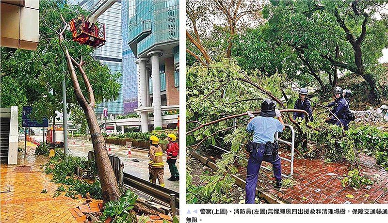 在金鐘正義道,警員冒雨用電鋸鋸斷比較大型的樹枝,清理路面讓車輛行駛。在西貢南圍,警方搬開阻擋車路的塌樹到旁邊行人路,以免影響交通。在深水埗區,警員處理了50宗塌樹報告。