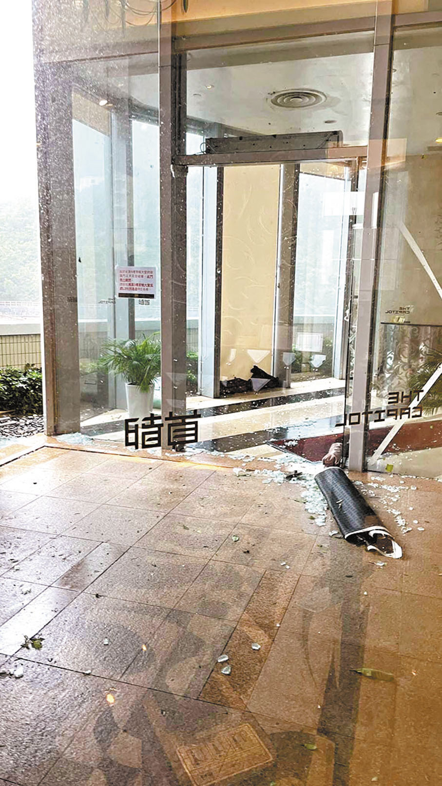 香港時隔5年後再次經歷十號風球洗禮。在「蘇拉」襲港期間,不少住戶反映其樓宇搖搖晃晃,玻璃窗更是一個單位裏最脆弱的地方,歌手蔡卓妍(阿Sa)的豪宅就難抵風雨而出現滲水情況。香港最東南方的將軍澳區成為「爆窗」重災區,原因除了強風造成的共振效應,也和雜物橫飛擊中玻璃有關。香港文匯報記者昨日直擊其中一個爆窗戶,戶主憶述中「流彈」經過仍心有餘悸:「突然之間砰一聲,玻璃窗全部爆裂、碎片滿地,我小腿有幾處被碎片擊中流血。」當時橫風橫雨,戶主徹夜難眠憂心水浸入屋。由於多戶「中招」管理處應接不暇,戶主要用木板自行修理。 ◆香港文匯報記者 廣濟