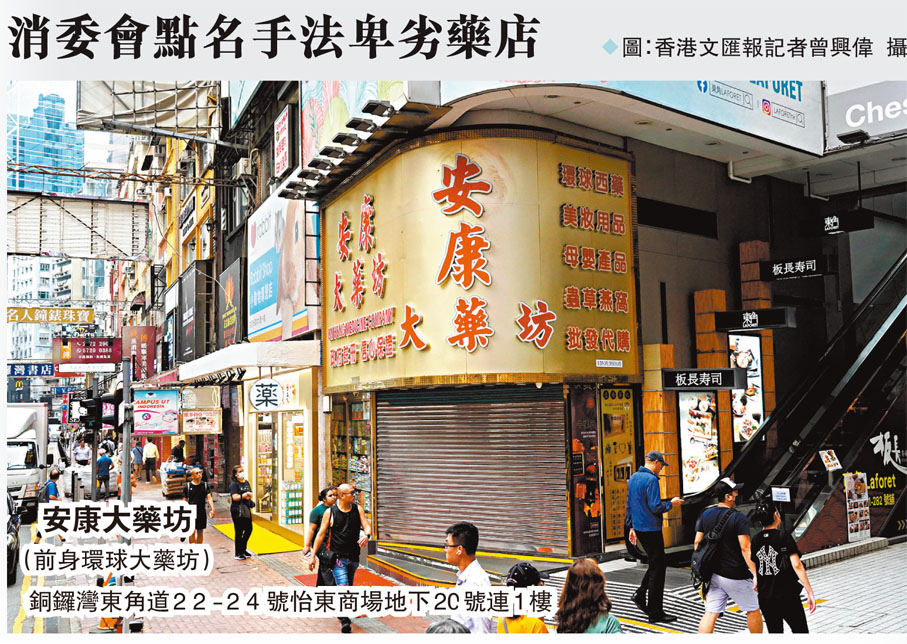 香港消委會昨日舉行記者會,公開點名4間藥店,包括「藥城」、「521生活百貨」、「環球大藥坊」及「安康大藥坊」,並嚴正譴責其經營手法。