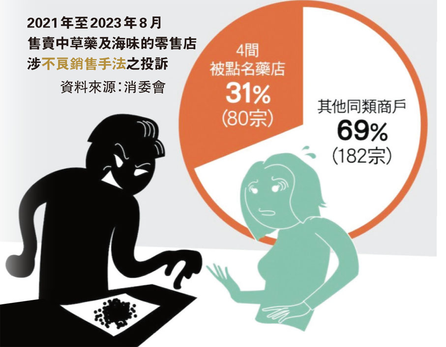 在2021至今年8月期間,消委會合共接獲96宗涉及該4間藥店的投訴,佔期內同類投訴31%,其中80宗涉不良銷售手法。單計今年首8個月,已錄得49宗相關投訴,超過去年全年的26宗,其中10宗投訴來自本地消費者,另39宗投訴分別來自內地、澳門及新加坡,涉款總額逾58萬元,平均每宗個案涉款1.1萬元。經消委會協調跟進後,店舖已全數或部分退款。