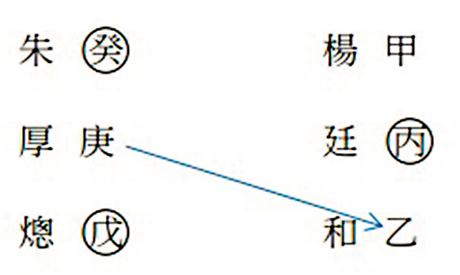 先一提明世宗的姓名總格為癸水庚金及戊土,(一)癸庚,大金配細水,即金大水涸,不懂軟語,甚至給人說話涼薄、麻木不仁的效果。庚金,享樂主義、現實。戊在外卦即陌生人,外力合癸,迎合自己化火剋庚金,淫亂至極,但遇上貴人楊廷和,順利得到帝位。