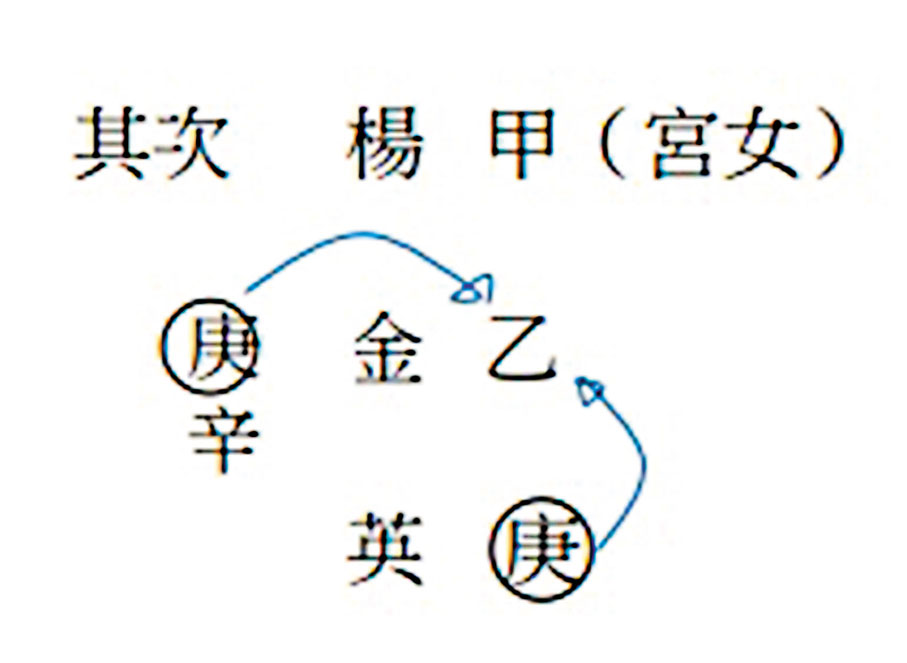 (一)大金庚金引發皇帝強行剋合楊金英的夫宮,加上乙木側有隱藏五行庚、辛,衝擊其夫宮。