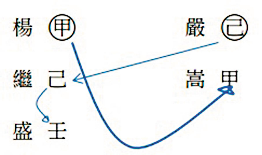 本來楊姓甲木進入「嵩」之甲木內,嚴字己土又進入繼字己土內,順理成章就是結盟成功,但由於己土剋不到壬水,而被反剋,水大土崩,故聯盟不成!