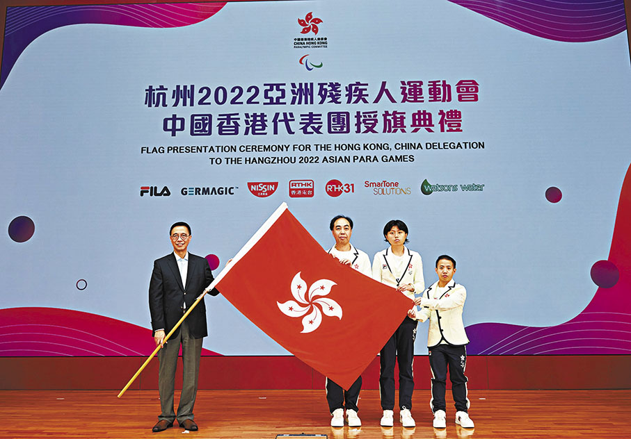 參加第四屆亞洲殘疾人運動會的中國香港代表團授旗儀式昨日舉行,圖為文化體育及旅遊局局長楊潤雄將香港特別行政區區旗授予中國香港代表團。