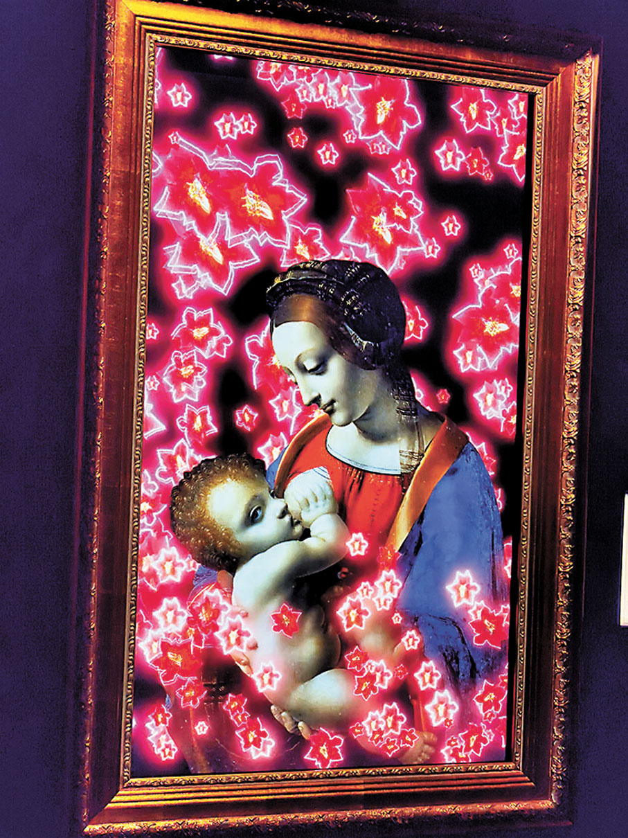 最後的「沉浸式空間」,則將《岩間聖母》在屏幕上放大,觀眾可以舒適隨意地坐在地上,全方位地被無數白花圍繞,在音樂中感受藝術作品。屏幕上聖母瑪利亞的神情與頭的角度也像在望着面前的人們,平和恬靜,形成一種從過去望向現在的跨世紀「交流」。此外,《最後的晚餐》亦以動態形式出現,作品中的人物面對着觀者,與旁邊的同伴交流時,也彷彿在觀者面前談話、用餐。
