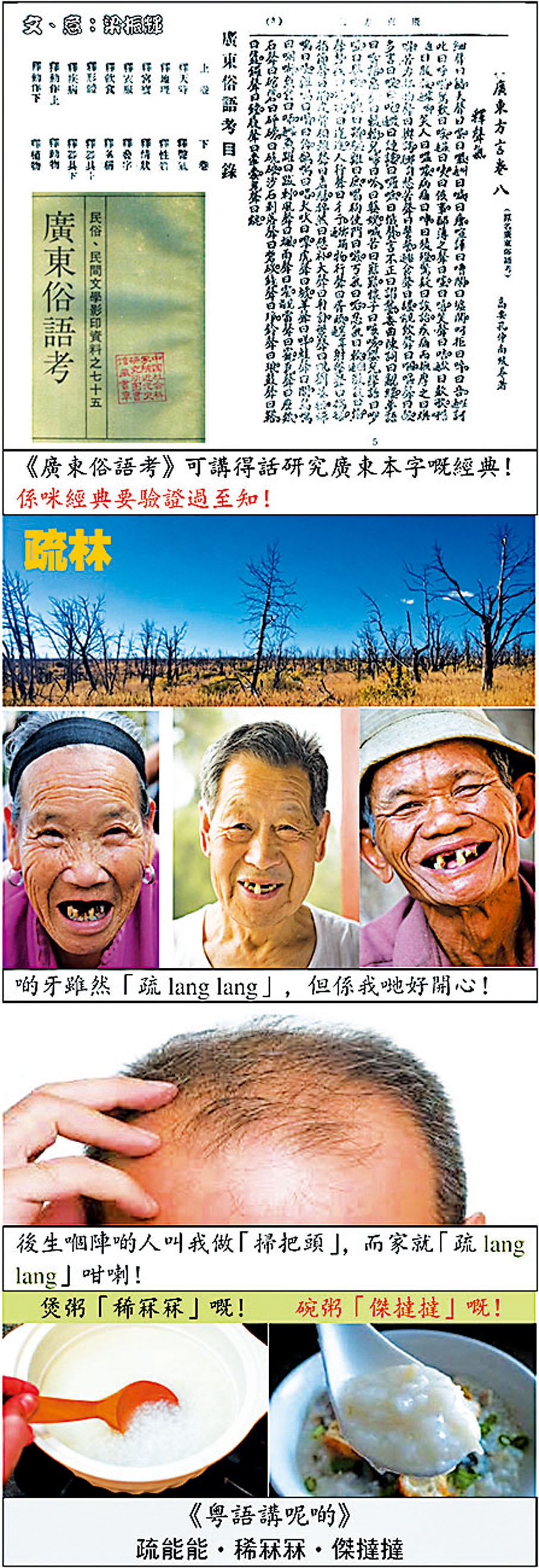 稀疏的林木叫「疏林」,廣東人就用了「疏林林」(讀作「疏能能」)來形容很稀疏的景象,如:個公園咁大範圍,種得嗰幾棵樹,「疏能能」咁!「稀」,疏也;所以廣東話也有「稀林林」,讀作「稀冧冧」。「塌」除指倒,也有貼緊的意思。「結」正是緊貼,廣東人就創造了「結塌塌」這個疊字形容詞來形容「好傑」的粥或糊。「塌」通過以下音變讀作「撻」: