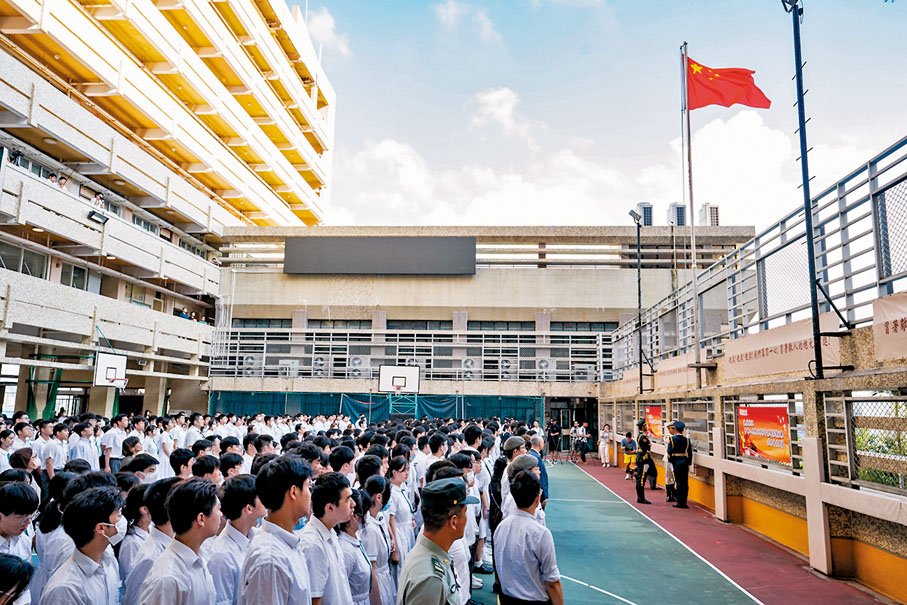 為慶祝中華人民共和國成立74周年,香港培僑中學昨日邀請解放軍駐香港部隊三軍儀仗隊來校為師生舉行升旗儀式。培僑中學校長伍煥傑表示,在國慶節即將到來之際,駐港部隊三軍儀仗隊為同學們上了一堂莊嚴的國旗課,培育了孩子們的家國情懷。 圖:中新社