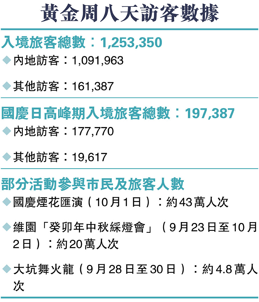 文化體育及旅遊局局長楊潤雄昨日表示,特區政府會總結今次黃金周經驗,為未來協調工作及提升旅客訪港體驗做好準備。根據入境處數字,8天黃金周長假期內地訪客人次約為2017年至2019年國慶黃金周約85%水平,或2017年至2018年的70%,平均最多內地旅客入境口岸為高鐵西九龍,其次是落馬洲支線。