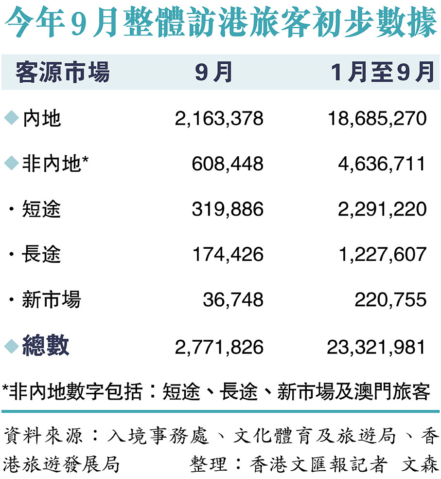 旅發局表示,本月起將繼續推出一浪接一浪的節慶宣傳推廣及大型盛事,包括萬聖節、香港美酒佳餚巡禮、香港繽紛冬日巡禮、香港跨年倒數等,吸引旅客來港親身參與和體驗。不過,受超強颱風和暴雨等極端天氣影響,以及暑假結束等因素,9月初步訪港旅客數字約277萬人次,累計今年頭9個月錄得超過2,330萬訪港旅客人次。