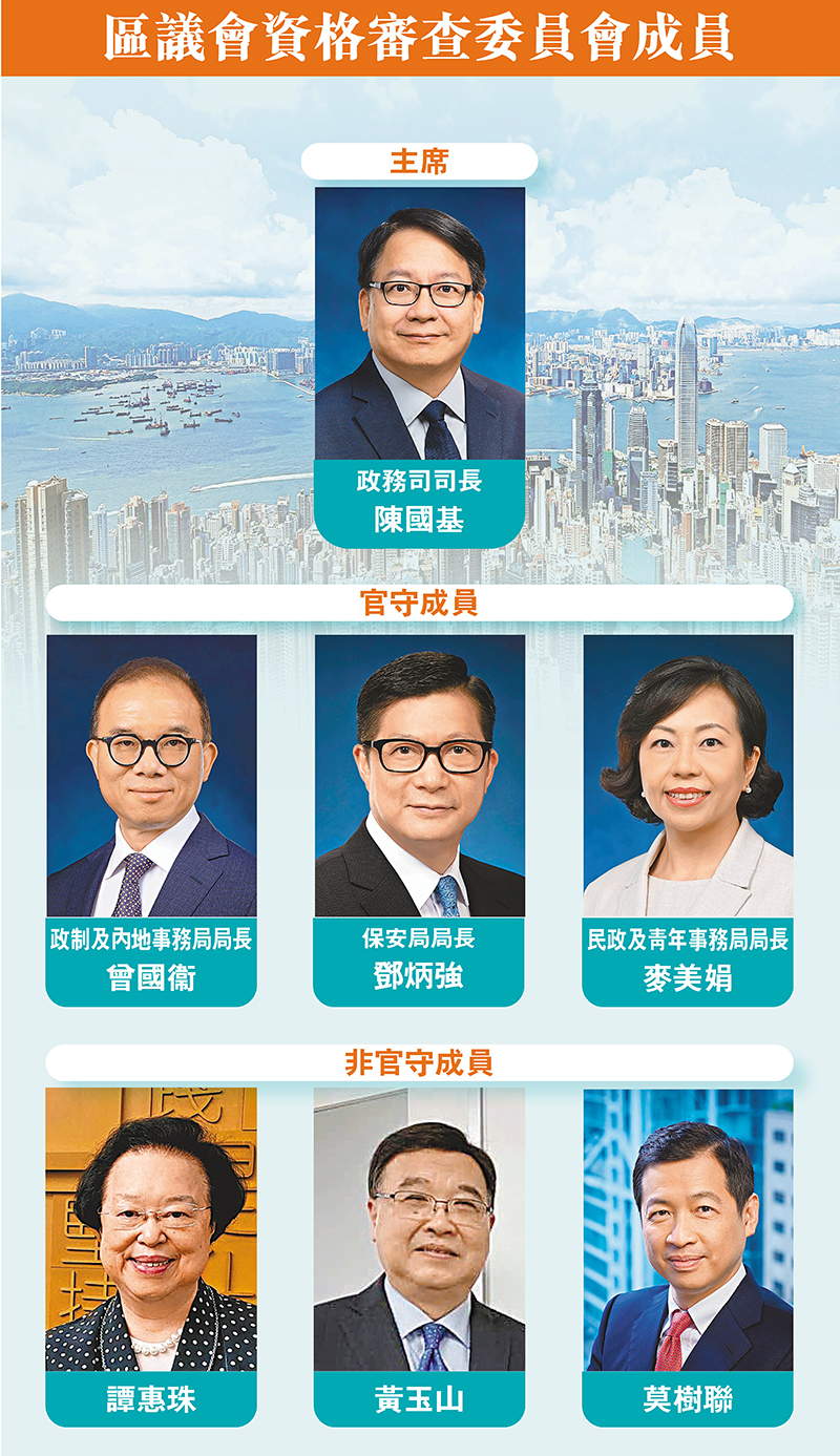 香港2023年區議會一般選舉提名期將於本月17日開始。特區政府昨日宣布由行政長官委任的區議會資格審查委員會成員,由特區政府政務司司長陳國基擔任主席,官守成員包括政制及內地事務局局長曾國衞、保安局局長鄧炳強、民政及青年事務局局長麥美娟,非官守成員包括全國人大常委會香港特區基本法委員會原副主任譚惠珠,基本法委員會委員黃玉山、莫樹聯,任期由2023年10月11日開始。有地區人士昨日接受香港文匯報訪問時表示,區議會資審會有助確保全面落實「愛國者治港」,認為區議會資審會要嚴格審查參選人資格,確保不讓別有用心者有機可乘,確保市民地區生活福祉得到保障。 ◆香港文匯報記者 鄭治祖