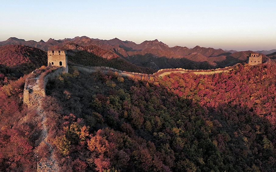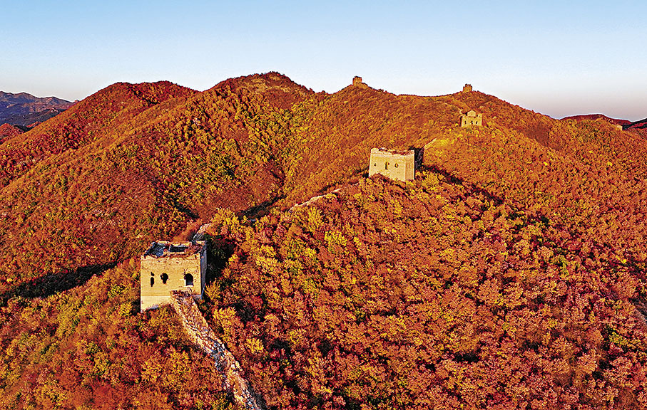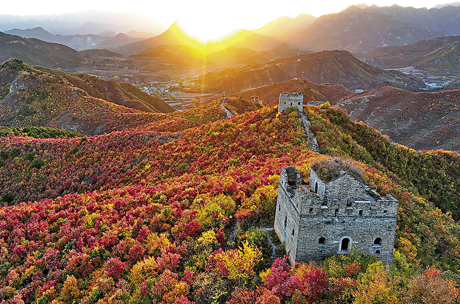 河北省秦皇島市海港區境內的長城景區層林盡染、色彩斑斕,景色美如畫卷。長城如同一條巨龍蜿蜒於群山之巔,被秋色裝扮得更顯雄壯。