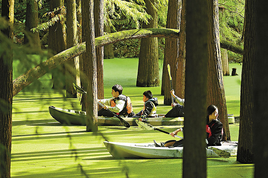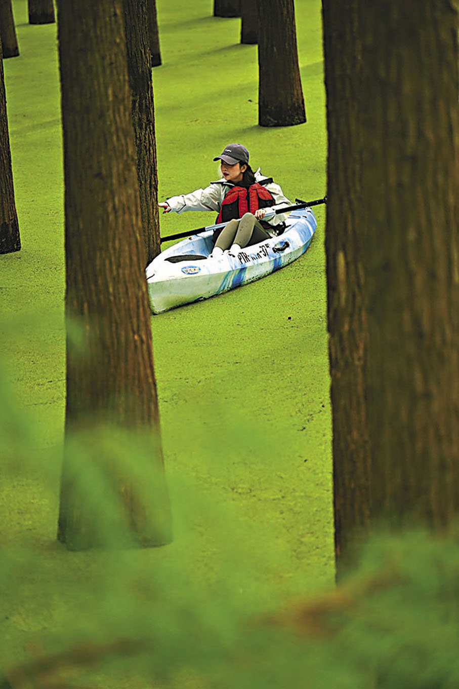 浙江杭州臨安青山湖近百畝池杉和落羽杉混交林呈現「抹茶森林」景觀,引得大批遊客前來泛舟、漫步觀光。這片浸沒於水中的森林每到秋季就會鋪滿浮萍,浪漫景觀宛如「綠野仙蹤」。